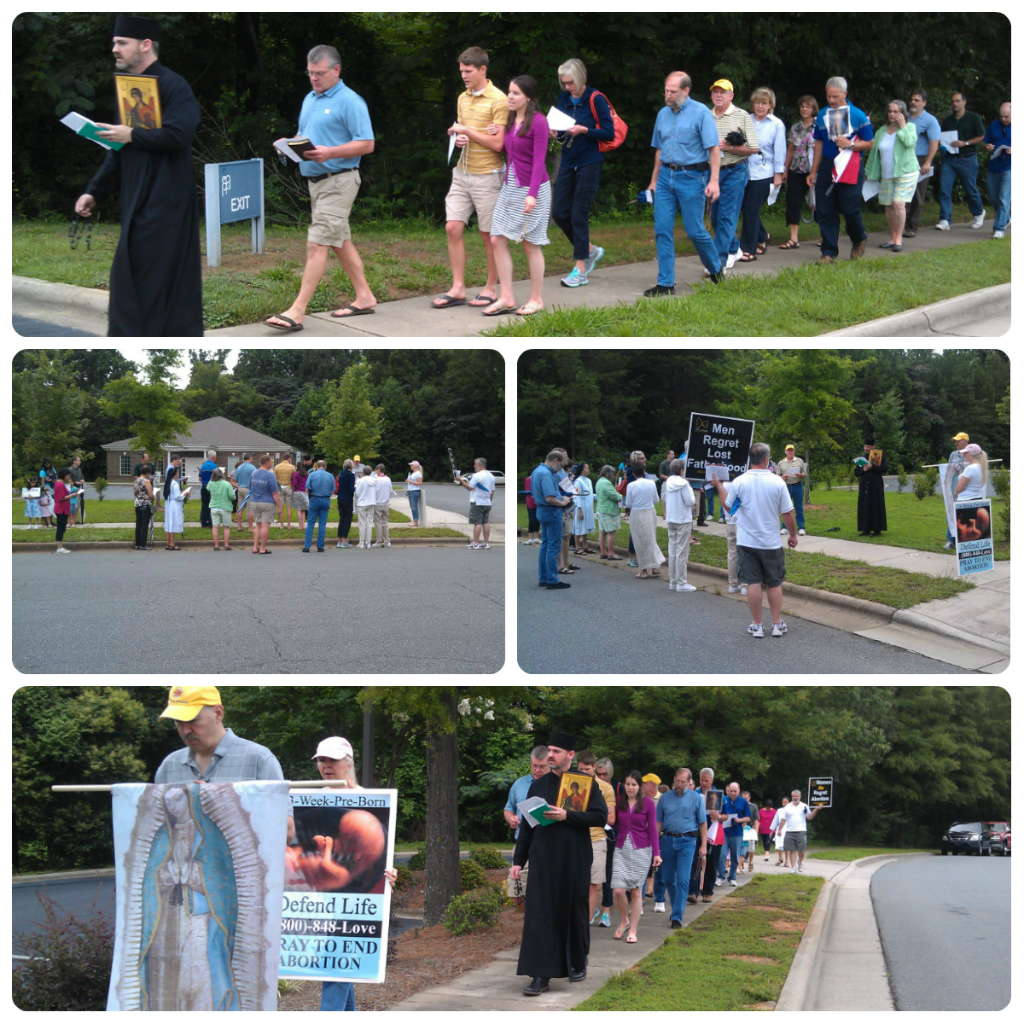 Thanks to everyone who came out to our Saturday, July 13th Charlotte Helpers pro-life prayer vigil. We had morning mass at St. Thomas Aquinas Catholic Church, then prayed at the Latrobe Drive abortion clinic with Fr. Deacon Matthew Hanes of St. Basil’s Ukranian-Greek Catholic Mission which currently meets in the chapel on the campus of St. Thomas Aquinas. We had a great turn-out, 31 people joined us and the rain held off just long enough for us to finish our rosary, thanks to those staying behind and praying before Our Lord in the tabernacle back at the chapel (special thanks to Michael and Mary Jo!). After we met back up in the chapel for closing, Fr. Deacon led us in a beautiful chanted Marian prayer that dates to the 7th century. Thanks to everyone who made this a great vigil . . . and hopefully an efficacious one too. This particular vigil was a great reminder that our most powerful weapon to fight against evil in our world is the liturgy of the Church . . . through the prayers of the Church, the Divine Liturgy (the Holy Sacrifice of the Mass) and Eucharistic Adoration. See you next month!