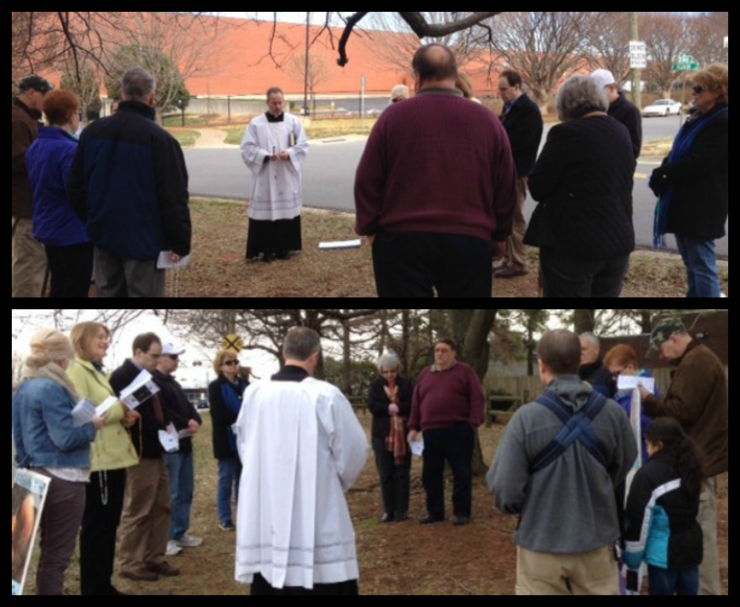 We had such a great March vigil – thanks to all who came out. It was somewhat difficult to do a head count as we had so many Catholics on the sidewalk! About 36-38 of us who came from Mass at St. Thomas Aquinas to Latrobe were met by a group of approximately 20 parishioners from St. Michael’s in Gastonia. While we were praying, there were also other Catholics doing sidewalk counseling – the Griffin family from St. Patrick’s and the Harrison family from Sacred Heart. Also present was a group of about 4-6 people praying the rosary in Spanish. That’s what it’s all about! Catholics in action spiritually fighting against perhaps the greatest evil of our generation, culture, and nation.